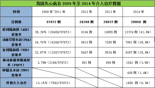 根据国家卫计委先天性心脏病介入治疗信息网络直报系统统计,除西藏、香港、澳门、台湾外,我国先心病自2009年至2014年介入治疗相关数据情况比较。